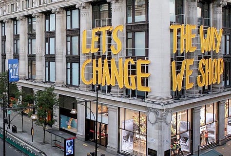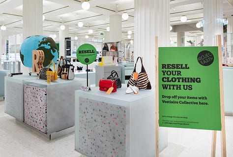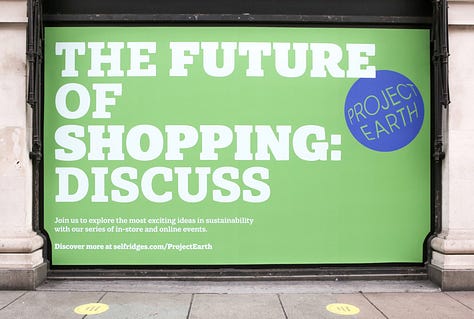 In 2020, UK department store Selfridges took a different approach. They established a movement called ‘Project Earth’ which focused on all aspects of the shopping experience, from product curation (highlighting sustainable fashion brands) to the rental, repair, and a luxury handbag buy-back scheme. The beauty department championed plastic-free products, whilst their restaurants and food halls promoted plant-based and organic foods. In 2024, this initiative evolved into ReSelfridge, and the mission now also includes sustainable packaging and the use of sustainable materials in-store.