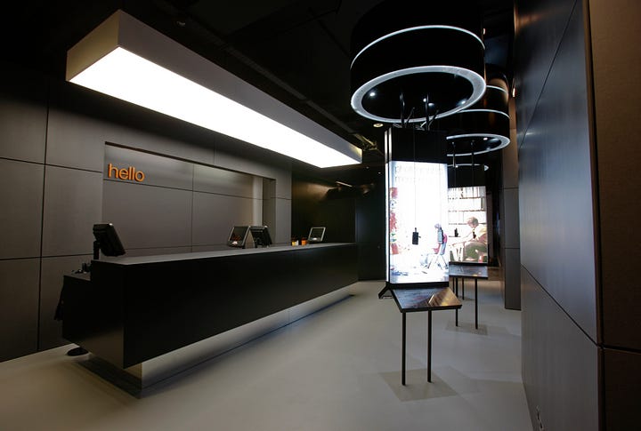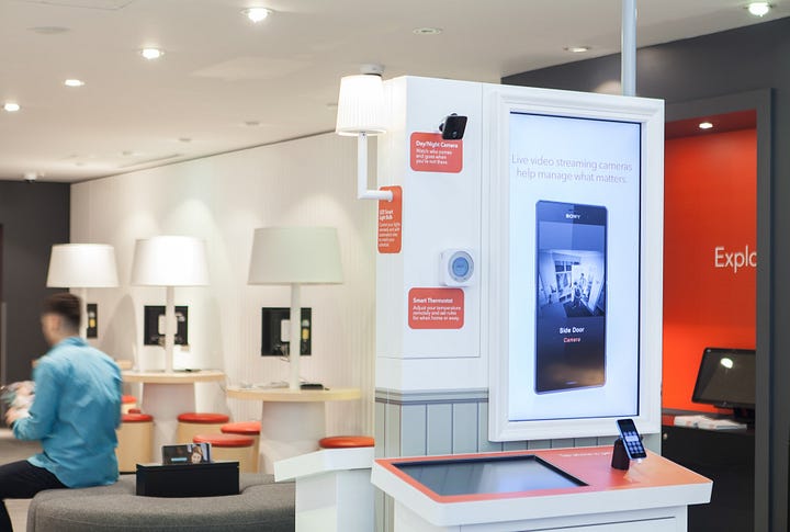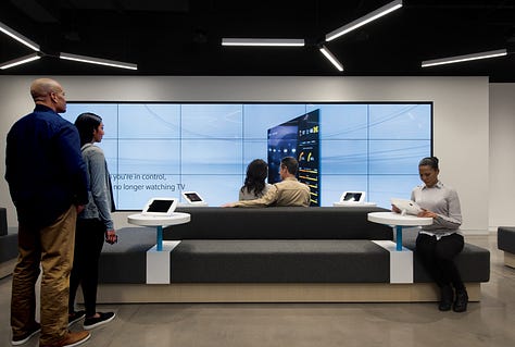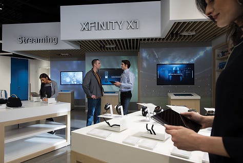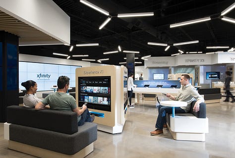 For our store format for Comcast, we looked closely at how customers engaged with the height of the surfaces and counters. A high counter, which customers can easily lean on, is perfect for informal discussions. Lower-height surfaces are more suited to showcasing services and content in an almost museum-like setting. A counter height that’s a little bit higher than normal encourages customers to pick up and play with products.