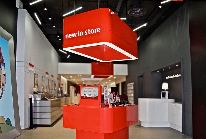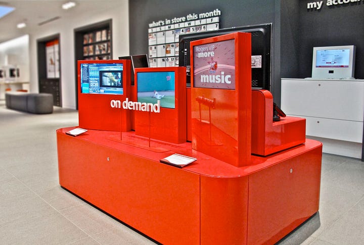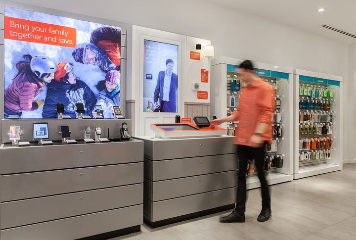 For a store format concept for Rogers Telecommunications, we used the angle of the digital screens to indicate what was expected from the customer. Straight, vertical screens were used for viewing content, a passive interaction. Angled screens invited customers to touch and engage in a more interactive experience.