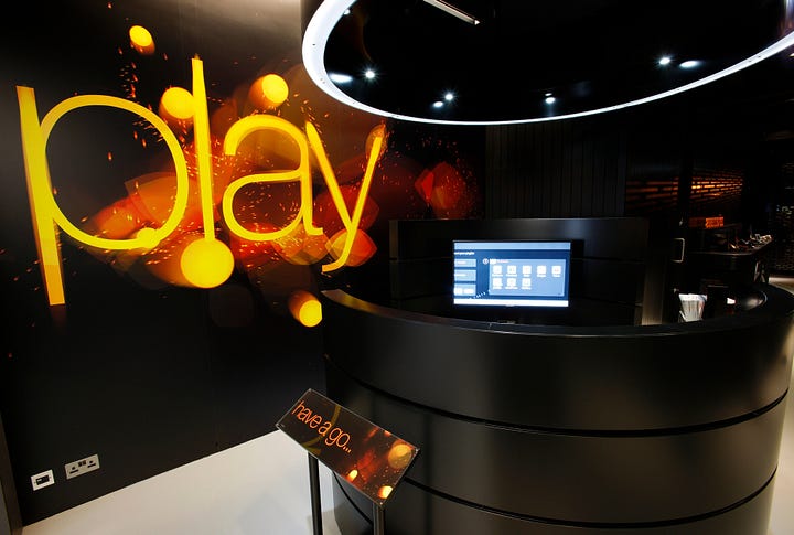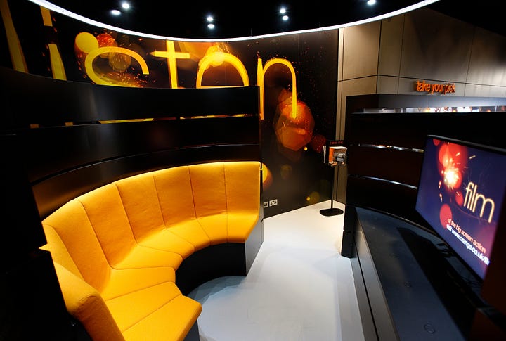 We created a digital playground-themed store for telecommunications brand Orange. Location-based services and demo products were hung from the ceiling, so customers could interact while standing, as if they were on the move. In the home area, an experience pod used a lounging posture similar to one you might have on your sofa at home. This had a steep recline, high back and was upholstered in a soft, tactile fabric that felt warm and comfortable. It was all about creating a relaxed, homely feel in which customers could try out home internet and cable products and services.