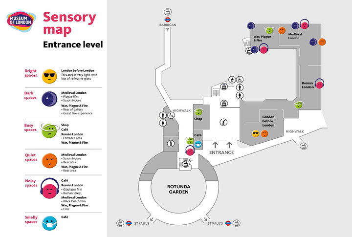 Stores can also communicate details about the physical environment. Like store processes, customers can prepare in advance for sensory stimuli they might encounter while shopping. The Museum of Victoria in Melbourne, Australia, provides sensory maps that colour-code areas according to the quantity of multimedia, noise and light. Available online or on-site, this allows visitors to exclusively visit low-sensory areas or prepare for high-sensory areas ahead of time. Dividing areas according to sensory inputs like this is a luxury of large-scale formats and may not be practical for many retail stores. Yet, awareness and consideration of sensory stimuli are something that no store or retail designer is exempt from.