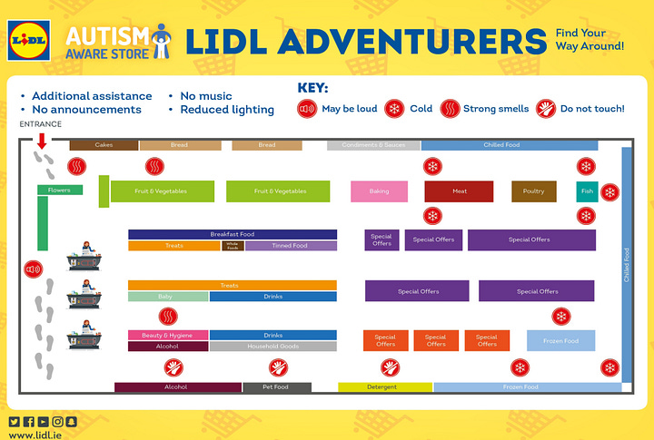 A common strategy we currently see to accommodate neurodivergent customers (mainly in supermarkets) is to set dedicated weekly times when the store environment is tailored to the sensory needs of these customers. Supermarkets such as Asda, Lidl, and Morrisons in the UK, Supervalu (Ireland), Carrefour (France) and Coles (Australia) have a dedicated hour with ‘quieter’ conditions: lights are dimmed, there are no store announcements, and checkout beepers are turned off. Vodafone (Ireland) offers autism-friendly shopping hours (9-11 am), where additional appointment times are made available so customers do not have to wait in-store. To complement this, service noises are minimised, priority seating is provided, and assistance dogs are welcomed. Also, autism ambassadors working in the store wear lanyards to support communication needs in person. Since 2017, over 16,000 shops in the UK have dedicated store times to benefit autistic shoppers, following an annual initiative created by the National Autistic Society. Having a dedicated time may be the most abrupt store adjustment, but it may also be the most beneficial for customers with more significant atypical sensory needs.