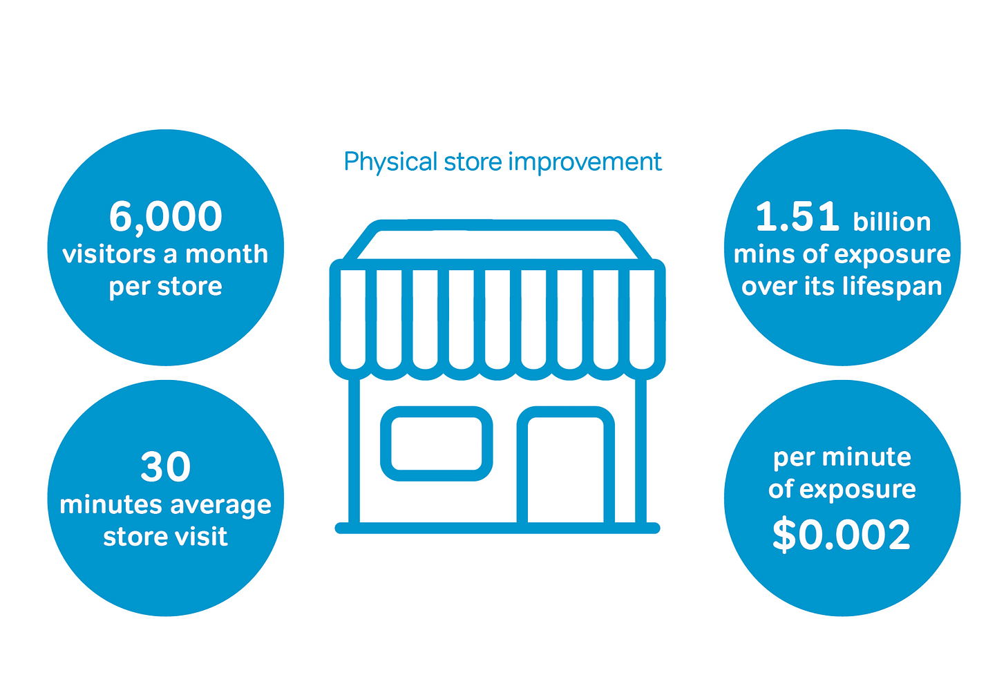 One store sees 6,000 visitors per month, totalling 72,000 annually. With each visitor spending around 30 minutes in the store, this results in 2,160,000 minutes of exposure per store annually. Across 100 stores, this translates to 216 million minutes of exposure per year. Over a seven-year period, the typical lifecycle of a retail store, this amounts to a staggering 1.51 billion minutes of exposure. Breaking it down, the cost per minute of exposure is a mere $0.002.